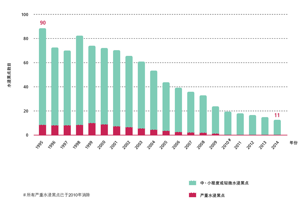 我们于2014年年初进行年度检讨,评估了各项已完成排水改善工程的成效,并进一步剔除了两个位于北区古洞石仔岭以及高埔、简头村、军地一带的水浸黑点,全港水浸黑点由13个减至11个。