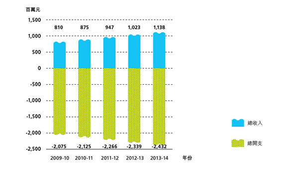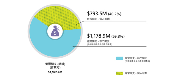 2013-14年度,本署的總營運開支約為20億元,其中個人薪酬的開支約為7.94億元,餘款則用於部門其他經常及非經常開支。
