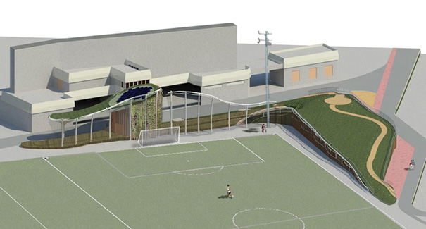 由於工程位於跑馬地遊樂場內,我們採用了「草坡下的泵房」的設計概念,將泵房與周圍環境融為一體。擬建泵房和風扇房的外牆,均將設有綠化面或草坡,以減低對視覺的影響。泵房頂部的草坡及蓄洪池入水口上蓋的空間,亦將用作公眾休憩區。