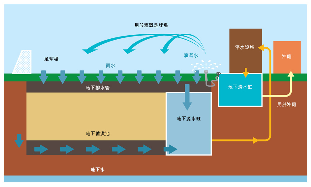 快活谷馬場是跑馬地的地標,該處的跑馬地遊樂場設有11個球場、緩跑徑、健身設施及大型綠化地帶。這些設施每日需要耗費大量水資源作灌溉和沖廁等用途。我們把握機會,在跑馬地地下蓄洪計劃中加設水資源採集及回用系統,回收地下水、過剩的灌溉水及雨水,將其適當處理後再用於灌溉和沖廁,系統啟用後將大幅減少食水的使用量。