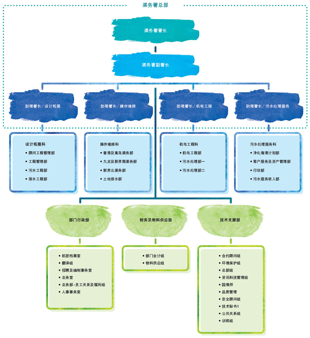 渠务署总部之下设有4个分科,各由一位助理署长领导,各分科人员拥有不同专业范畴的知识,为提供渠务署各项服务奠下良好基础。