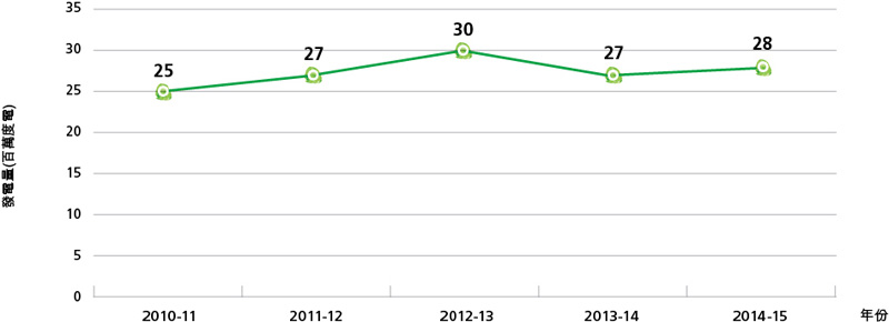 我們在轄下設施安裝電熱聯供發電機及微型渦輪系統,利用污水處理過程中產生的生物氣發電,從而提高整體的能源效益。截至2015年3月,各污水處理廠的相關系統發電量如下: