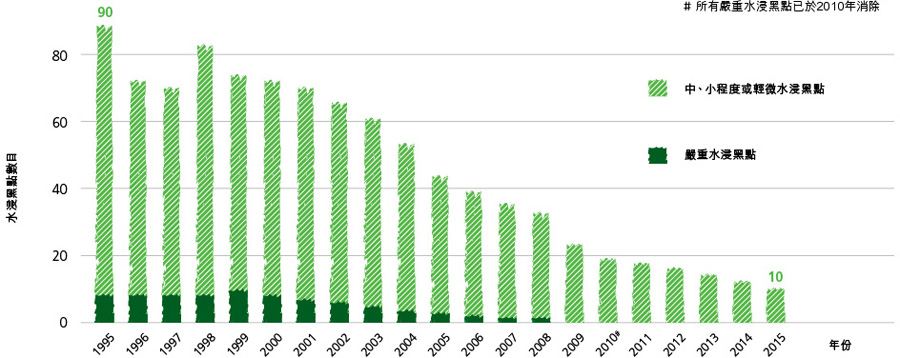 我們於2015年年初進行年度檢討,評估各項已完成排水改善工程的成效後,進一步剔除了位於屯門新村的水浸黑點,令全港水浸黑點由11個減至10個。