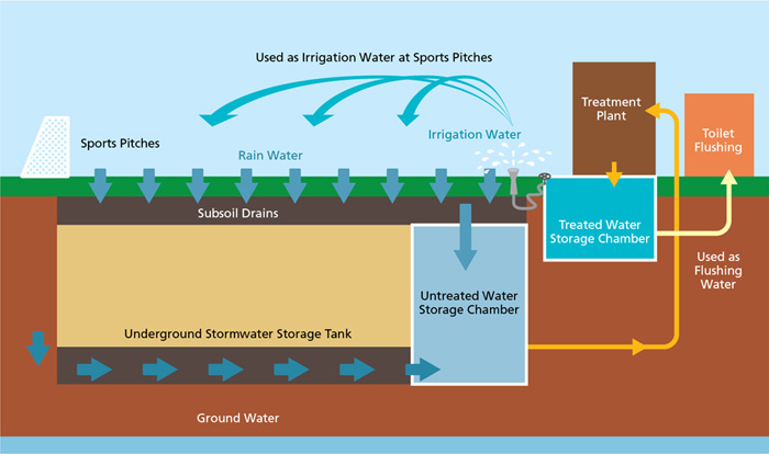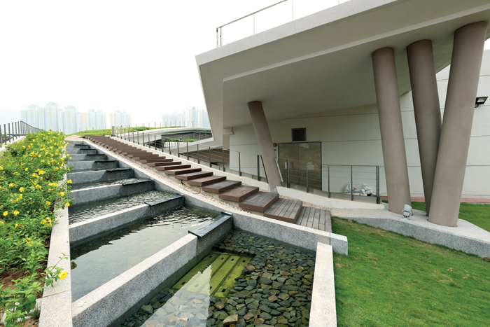 DSD has incorporated concepts of sustainable water resources management into its newly constructed facilities, raising their water resources utilisation rates. Major design elements include rainwater harvesting systems (RHS), underground stormwater storage systems, rain gardens and porous permeable pavements. Rain gardens, for instance, amalgamate water resources management and garden landscaping by filtering rainwater through garden plants and soil to improve runoff water quality and reduce the flow entering underground drains. In addition to aesthetic value, rain gardens provide ecological habitats and improve biodiversity.