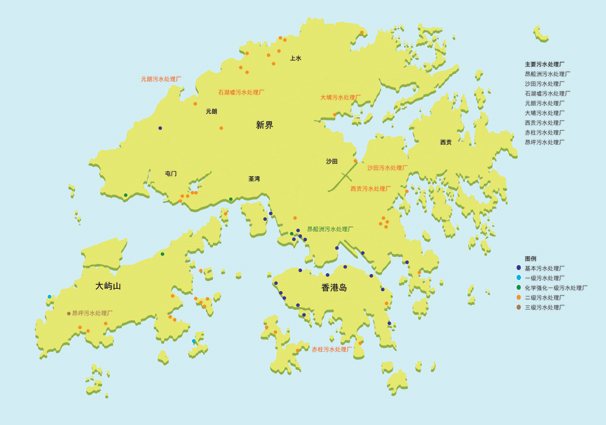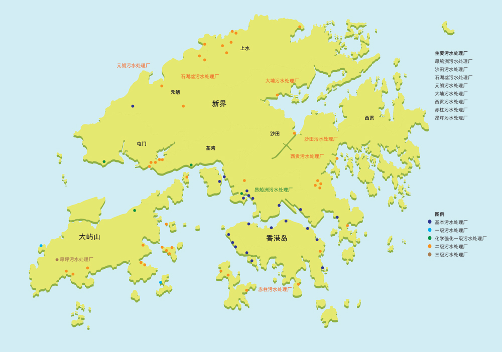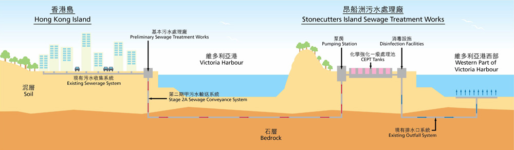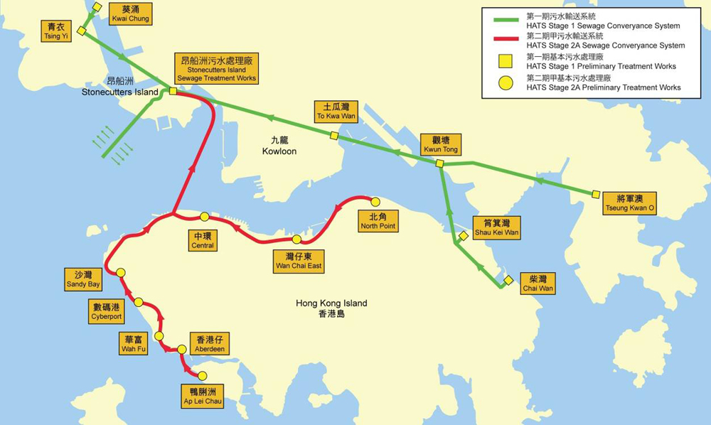 - 建造长约21 公里的深层污水隧道,把港岛北部和西南部产生的污水输送到昂船洲污水处理厂进行化学强化一级处理