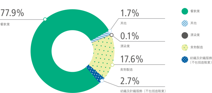 全港約有291萬個自來水用戶,其中大約269萬個用戶須繳付排污費。非住宅用戶中,約有25,800個用戶屬於須繳付工商業污水附加費的27個指定行業。工商業污水附加費繳納戶所屬行業的分佈見下圖。