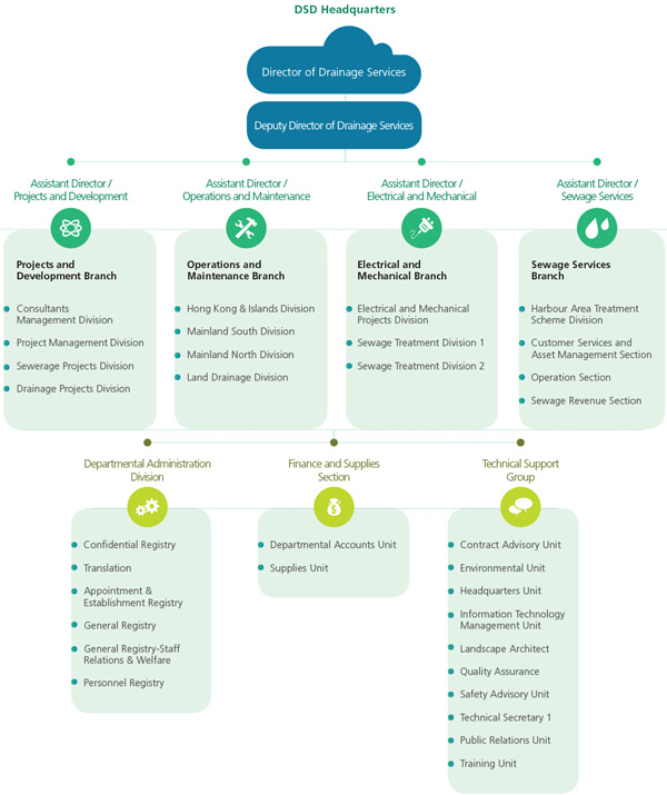 DSD consists of four branches with a staff establishment of 1,937. Each branch is led by an Assistant Director and is responsible for providing technical and professional support services in its specific field. The duties of each branch are as follows: