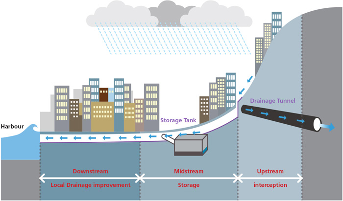 The principle of stormwater storage scheme is to temporarily store stormwater during heavy rainstorm in an underground tank, thus relieving the burden of downstream drainage system. When the stormwater in the downstream drainage system recedes, the stormwater stored in the tank will be pumped out to relieve storage space for the next rainstorm. Currently there are 3 underground stormwater storage tanks located at Tai Hang Tung, Sheung Wan and Happy Valley respectively.