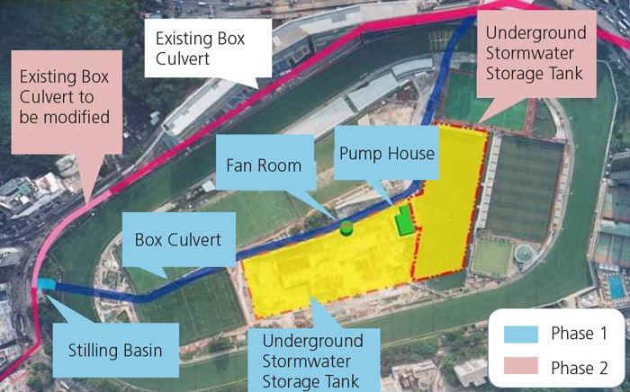 The construction works for the Scheme commenced in 2012 comprising the construction of a stormwater storage tank underneath the Happy Valley Recreation Ground, a box culvert of about 650 metres long and a stormwater pump house with a peak flow rate of 1.5 cubic metres per second. It will serve as a storage tank to collect and temporarily store the runoff during heavy rainstorms to relieve the discharge load of the downstream drainage system and thereby alleviate flooding risks. The Scheme is divided into two phases. After the commissioning of the project, the flood protection level in Happy Valley and Wan Chai districts will be increased to withstand heavy rainstorms of a 1 in 50-year return period, safeguarding the lives and properties of citizens in the districts. This is also the first flood prevention project in Hong Kong to combine the use of Movable Weir and the Supervisory Control and Data Acquisition (SCADA) System. The Approved Project Estimates for the entire project is about $1.07 billion.