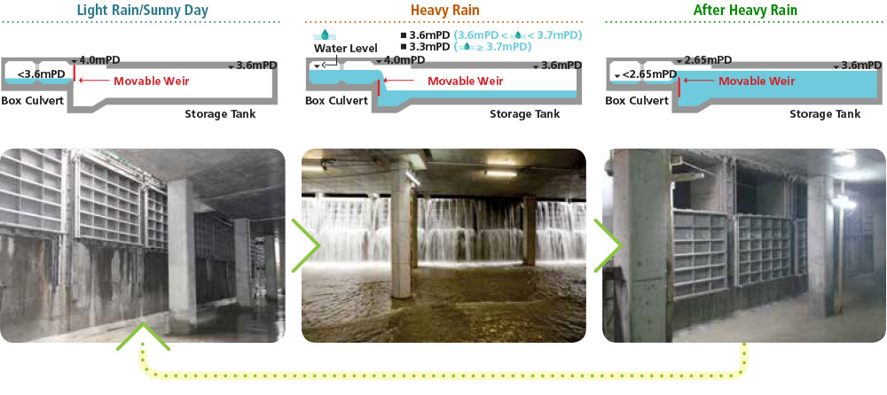 Being the first flood prevention project in Hong Kong to combine the use of Movable Weir and SCADA System, HVUSSS real-time monitors the tidal level and the water level inside the storage tank and the box culvert immediate upstream and downstream of the tank. The positioning of the Movable Weir is based on the real-time monitoring data such that the overflowing of rainwater from the box culvert to the tank can be triggered at the most optimal time, thereby reducing the required design capacity.