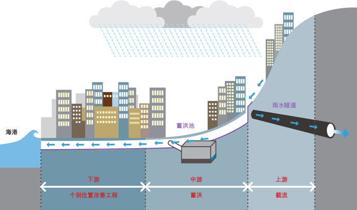但随着全球气候变化加剧,引致海平面加速上升、极端暴雨及风暴潮增加,香港需要作出更多新尝试,以便有效应对未来的防洪挑战。配合香港的可持续发展及应对气候变化,渠务署除参与政府跨部门小组,联手应对气候变化的影响,及检讨各区的雨水排放整体计划外,近年亦开始参照「海绵城市」理念,以顺应自然、弹性适应的方法,在渠务设施加入绿化天台、多孔透水路面,以促进渗透,减少地面径流;规划河畔公园及蓄洪湖等具蓄洪功能的休闲设施,以减低流量,达到蓄洪和滞洪的效果;采用雨水收集及回用系统,以增强城市的水循环效应,提高城市的耐洪能力。
