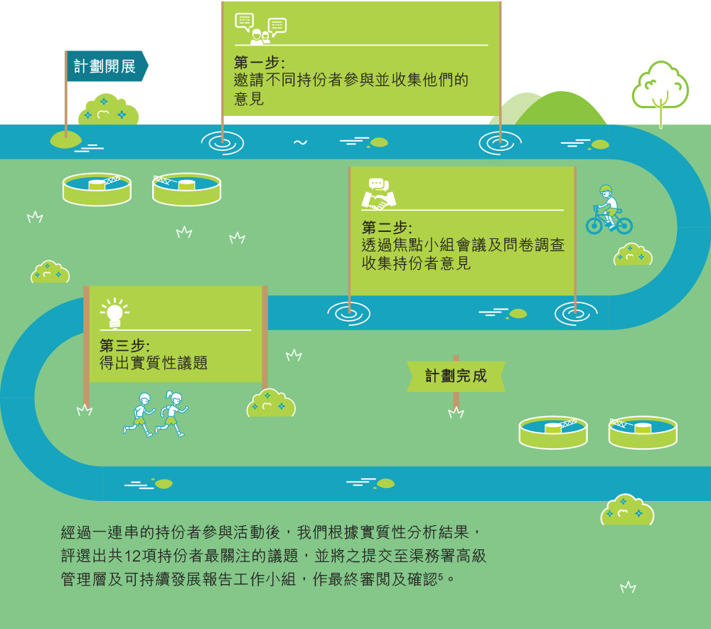 GRI標準著重議題的「實質性」,鼓勵機構匯報對自身及其持份者影響較大的議題。為釐定這些議題,我們自2013-14年起每年舉辦持份者參與計劃,分階段邀請不同組別的持份者,共同探討對渠務署工作的關注事項2。本署在2017年4月至6月期間,分別透過焦點小組會議及問卷調查,邀請不同持份者參與並收集他們的意見,並將所得結果加以整合及分析3,4.