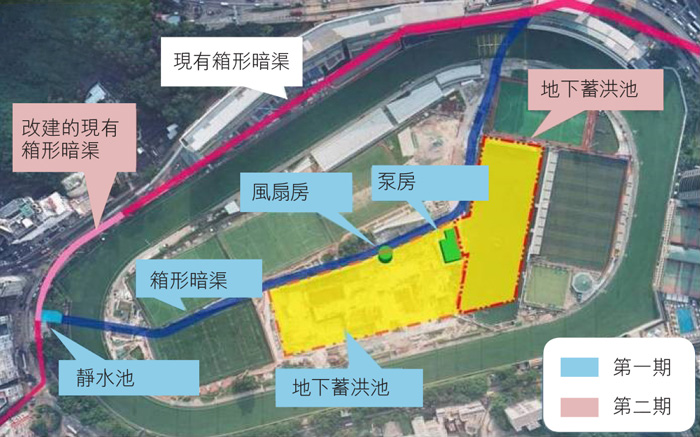 跑馬地地下蓄洪計劃於2012年展開,工程包括於跑馬地遊樂場地底興建一個地下蓄洪池、長約650米的箱形暗渠,以及一個抽水量達每秒1.5立方米的雨水泵房。暴雨時,箱形暗渠內的雨水溢流會被引進蓄洪池作暫時儲存,從而減輕下游的水浸風險。計劃分兩期進行,整個計劃投入運作後,跑馬地及鄰近灣仔地區的排洪能力提高至可抵禦50年一遇的暴雨,保障該區市民的生命及其財產。此項工程亦是本港首個結合智能水閘和數據採集與監控系統的防洪工程。整項工程的核準工程預算總值約10億7千萬元。