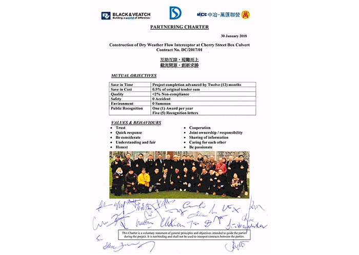 After group discussions, participants set a series of mutual objectives, including advancing project completion by 12 months, reducing project cost by 0.5%, achieving zero accident and zero environmental summon, as well as winning at least one award and five commendation letters every year. A partnering charter was signed accordingly. By dint of the partnering approach of NEC and its underlying spirit of advocating mutual support and understanding, overcoming challenges, striving for cost savings and innovating for success, we are confident that by joining forces with our partners we can overcome all challenges. We will make our best endeavour to improve the water quality and environment of the Tai Kok Tsui area within budget and to achieve early project completion.