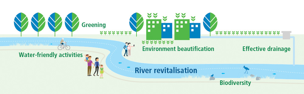 River sections are now undergoing detailed planning that ties in with their unique features, aiming to ensure full integration of drainage facilities with other land uses and strengthen community connectivity. This multi-purpose land use concept can create a better living environment. The examples below outline the concepts, designs and effectiveness of our river revitalisation initiatives.