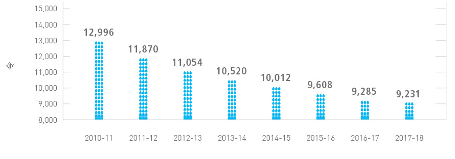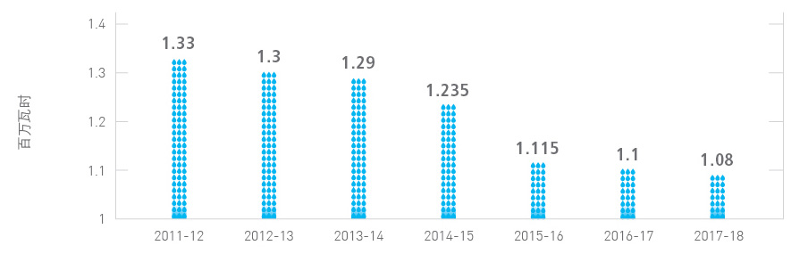 在《行动蓝图》中,政府进一步加强推广绿色建筑及减少政府建筑物用电量。事实上,本署多年来在办公室推行多项节能措施,包括把室温设定在摄氏25.5度、减少非必要照明,以及设定计时器于办公时间后关掉公用办公室设备,用电量因而持续大幅下降。相比2010-11年度,2017-18年度的用电量减少约18.7%,显示本署致力保护环境。