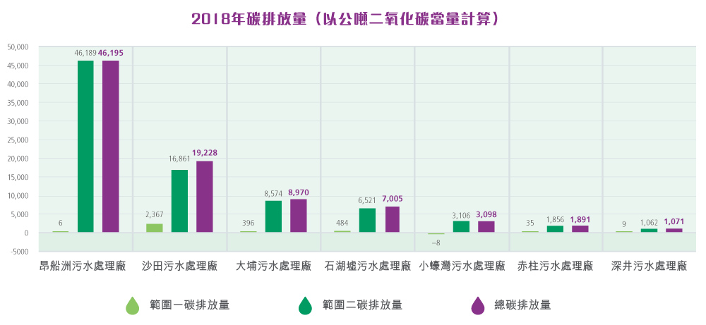 | 範圍一 | 經直接使用燃料而產生的直接排放+除氮過程中釋放的氧化氮+製冷劑排放+污泥消化池中的甲烷釋放–因植樹/太陽能移除的碳排放(以公噸二氧化碳當量計算) |