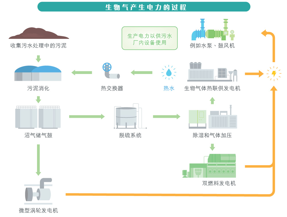 污水处理过程产生的污泥会在厌氧消化期间释出生物气。生物气约含65%甲烷(其余成分主要为二氧化碳),属于可再生能源。我们利用电热联供发电机和涡轮发动机燃烧生物气,生产电能和热能供厂房使用。2018-19年度,沙田、大埔和石湖墟污水处理厂共5台电热联供发电机的总发电容量约为3.6兆瓦;而沙田和元朗污水处理厂2台涡轮发动机的总发电容量则为280千瓦。年内,各污水处理厂的生物气总发电量相等于约2,700万度电。