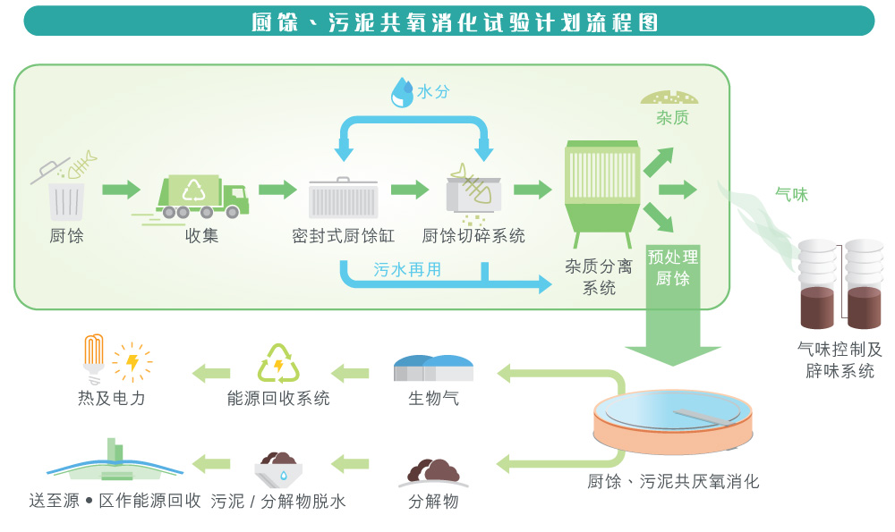 计划下,环保署的工程包括建造厨余预处理厂。在此,厨余会先去除杂质,再捣碎变成厨余浆。至于本署工程则包括改建接收厨余的指定厌氧消化缸。改建工程包括把缸内的混合器更换为可把较高固体含量的厨余与污泥混合物均匀搅拌的新混合器。试验计划已于2019年9月开始。其间,环保署负责收集、运送,预处理和泵送厨余至大埔污水处理厂内指定的厌氧消化缸。本署则负责操作消化缸和利用生物气生产热能和电力,供污水处理厂使用。