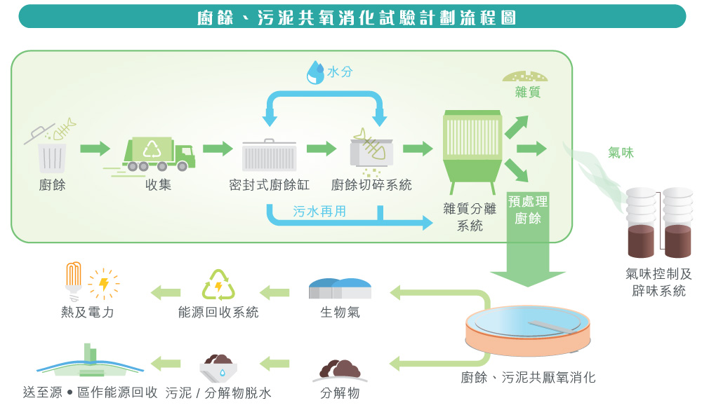 計劃下,環保署的工程包括建造廚餘預處理廠。在此,廚餘會先去除雜質,再搗碎變成廚餘漿。至於本署工程則包括改建接收廚餘的指定厭氧消化缸。改建工程包括把缸內的混合器更換為可把較高固體含量的廚餘與污泥混合物均勻攪拌的新混合器。試驗計劃已於2019年9月開始。其間,環保署負責收集、運送,預處理和泵送廚餘至大埔污水處理廠內指定的厭氧消化缸。本署則負責操作消化缸和利用生物氣生產熱能和電力,供污水處理廠使用。