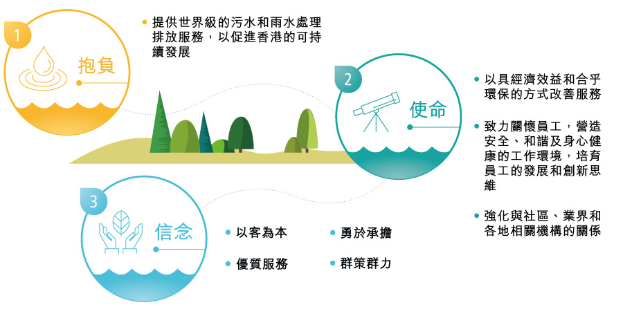 本署於1989年成立,為香港特別行政區政府發展局轄下9個部門之一。我們一直與時並進,為香港提供專業卓越的防洪及污水處理服務。我們的「抱負、使命和信念」貫徹可持續發展理念,可見我們決心推動香港的可持續發展,以應對氣候變化及城市發展帶來的挑戰。
