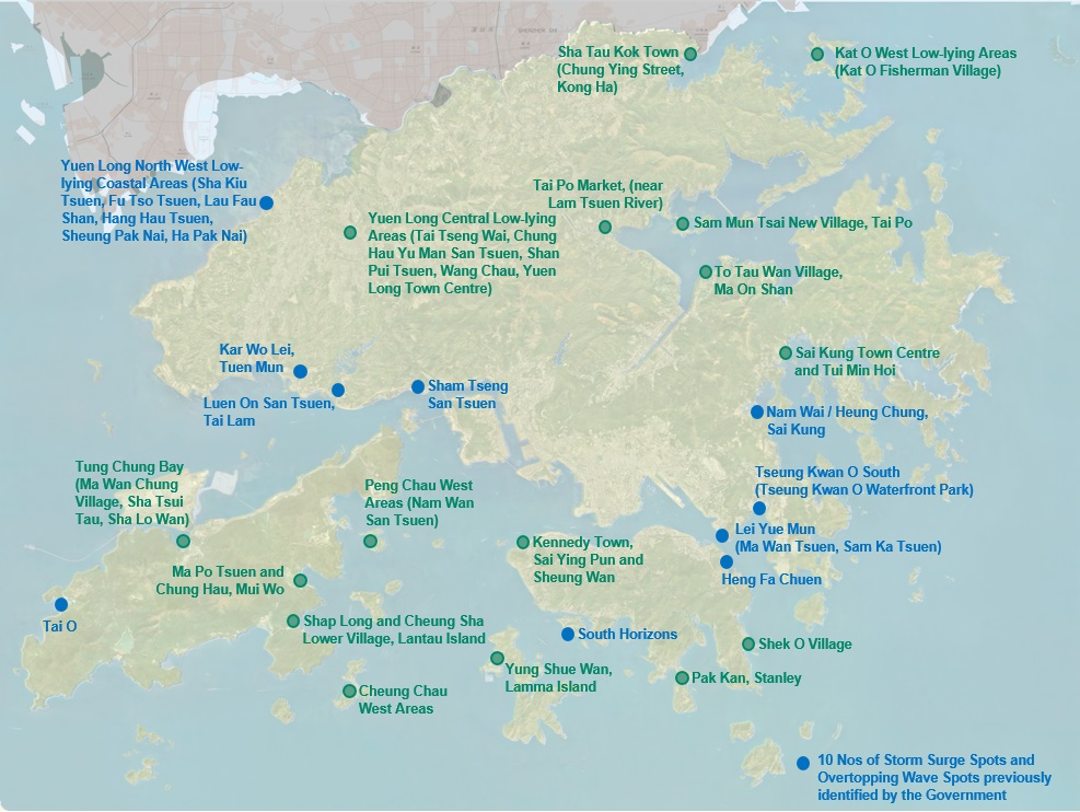 * These 26 areas have covered 7 Storm Surge Spots and 3 Overtopping Wave Spots. Based on the situation during the passage of severe/ super typhoon in recent years, the Government identified 7 locations vulnerable to serious seawater inundation (namely, Storm Surge Spots, including Tai O, Luen On San Tsuen, Kar Wo Lei, Sham Tseng San Tsuen, Lei Yue Mun, Sai Kung Nam Wai and Yuen Long North West low-lying coastal area) and 3 locations vulnerable to serious seawater inundation due to overtopping wave (namely, Overtopping Wave Spots, including Tseung Kwan O South, Heng Fa Chuen and South Horizons), and implemented a series of measures to minimize the flooding risk as far as possible. Please see the below links for details of the overview and measures for Storm Surge Spots and Overtopping Wave Spots.