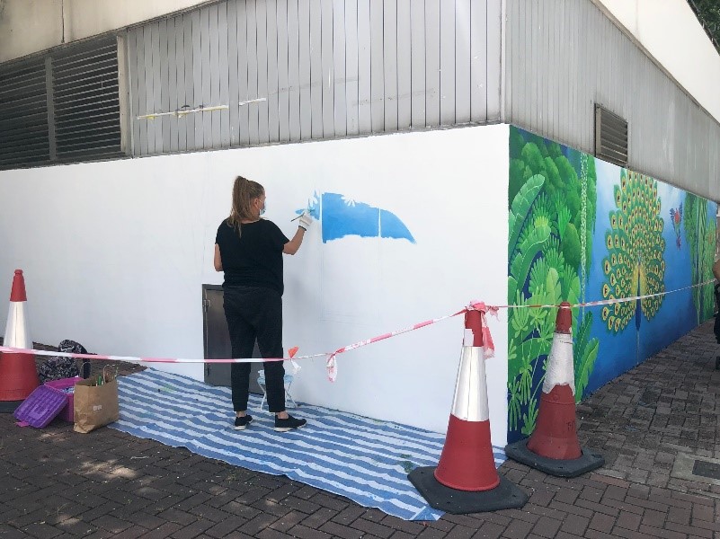 The artist spent about a month on the mural and completed in mid-July 2020. The nature-inspired mural has brought a refreshing change to the Whampoa area and the pumping station. While the walls are now covered with tropical trees and exotic flowers, the sky-blue background is also adorned with colourful macaws and an eye-catching peacock. The tree swing on the mural gives us a hint of relaxation and brings us into the nature. It creates a tranquil atmosphere for our minds to be transported from this buzzling city to the unspoilt countryside. The old blank concrete walls have been replaced by this vibrant tropical jungle which not only does beautify the environment, but it also makes the pumping station blend in with the community.