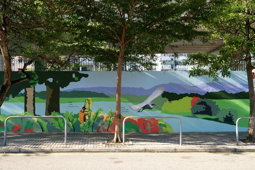 The design concept for the mural comes from the idea of blue-green infrastructure development. This echoes with DSD’s works in implementing different green elements in drainage channel improvement works. The enlarged indigenous species such as Black-faced Spoonbills, Romer’s Tree Frog, Great Egret and Hong Kong Newt, etc. which not only serve for educational purpose, but also can enhance the understanding of the community on river ecology, biodiversity and liveability.