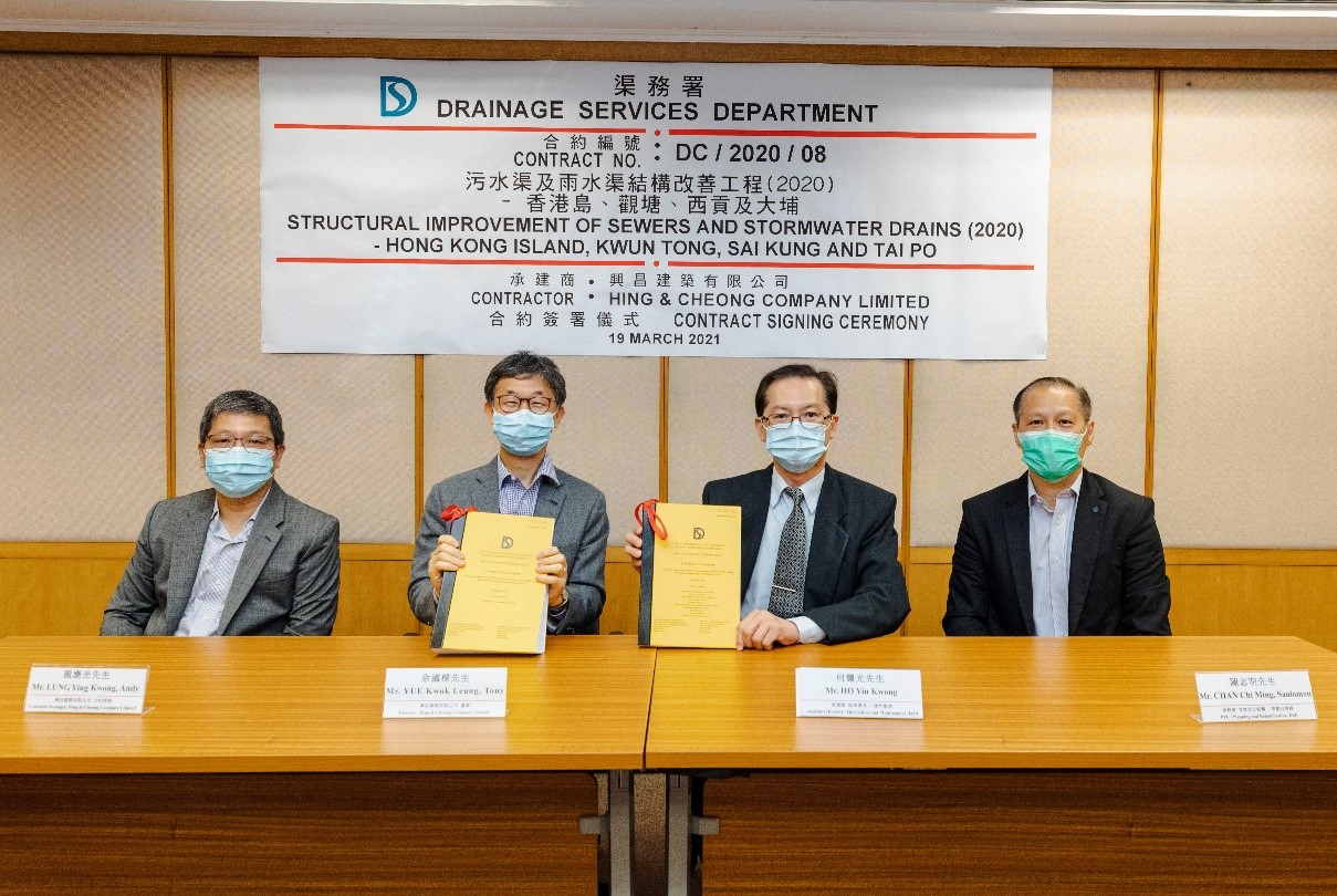 The Drainage Services Department signed a works contract of about $115 million with Hing & Cheong Company Limited on 19 March 2021. The works include rehabilitation of some sewers and stormwater drains and associated manholes on Hong Kong Island, Kwun Tong, Sai Kung and Tai Po. This 34-month works contract commenced on 10 March 2021.