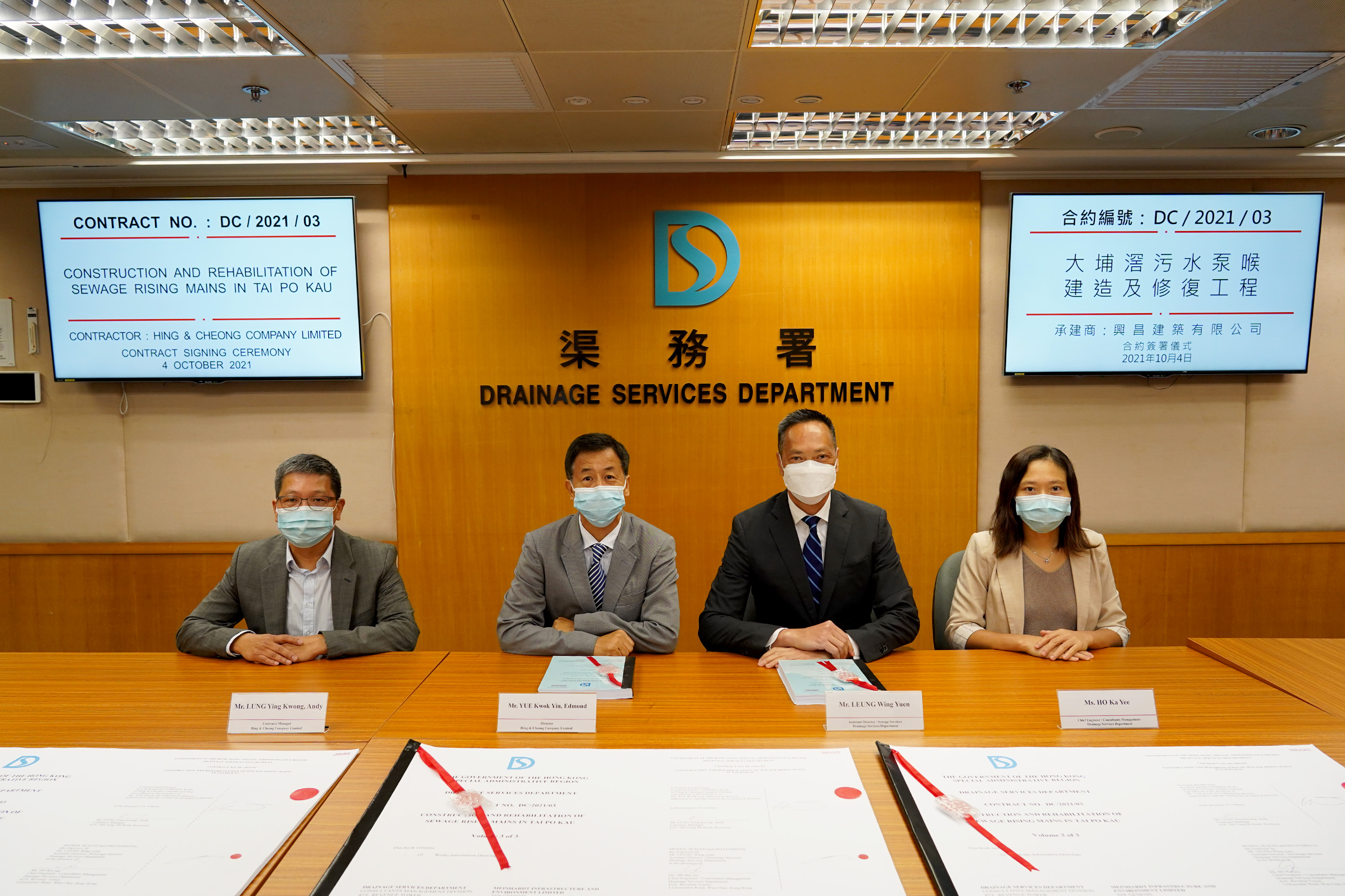 The Assistant Director/Sewage Services, Mr Walter LEUNG Wing-yuen (second right), Chief Engineer/Consultants Management, Ms Carol HO Ka-yee (first right) of DSD, the Director, Mr Edmond YUE Kwok-yin (second left) and Contracts Manager, Mr Andy LUNG Ying-kwong (first left) of Hing & Cheong Company Limited attended the contract signing ceremony