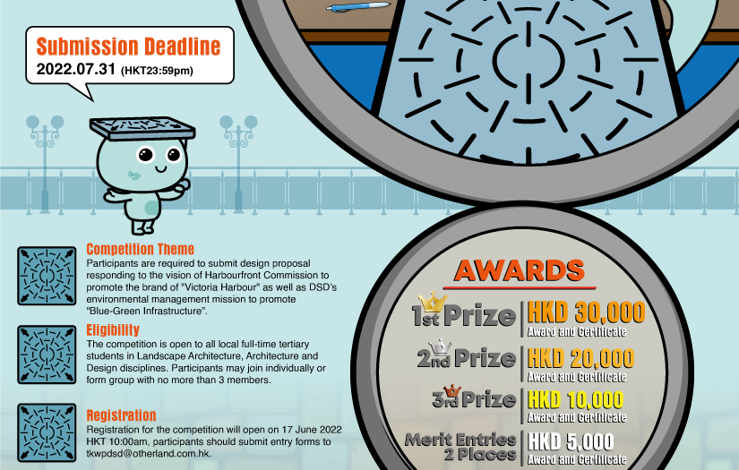 The Drainage Services Department plans to open up a 140m long waterfront at the To Kwa Wan Preliminary Treatment Works, and install a public artwork for decoration. Those who are interested in participating in this public artwork design competition (please refer to Eligibility in the poster below) shall submit their entry forms between the period from 10:00AM on 17 June 2022 and 30 June 2022. The deadline for submission of entries is 31 July 2022. An online briefing session would be held at 5:00PM on 10 June 2022 via video conferencing. (Click here for registration).