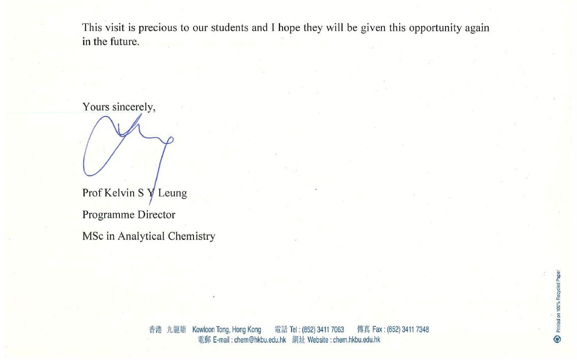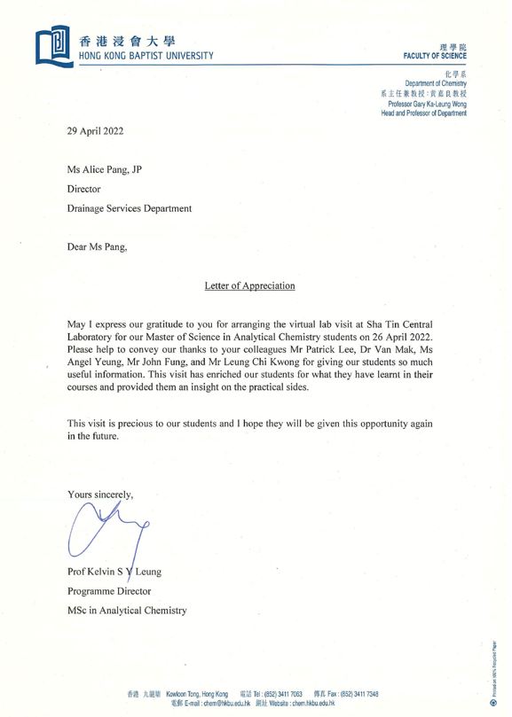 Letter of appreciation from Hong Kong Baptist University