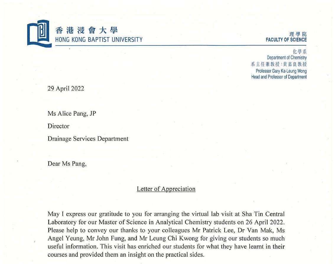 On-site visits to the sewage treatment facilities of the Drainage Services Department (DSD) were suspended due to the COVID-19 epidemic but the DSD had proactively adopted latest technologies and organised a livestreaming online visit at Sha Tin Central Laboratory for the chemistry students of Hong Kong Baptist University on 26 April 2022, enabling the students to have insights into the laboratory services and operation without visiting in person.
