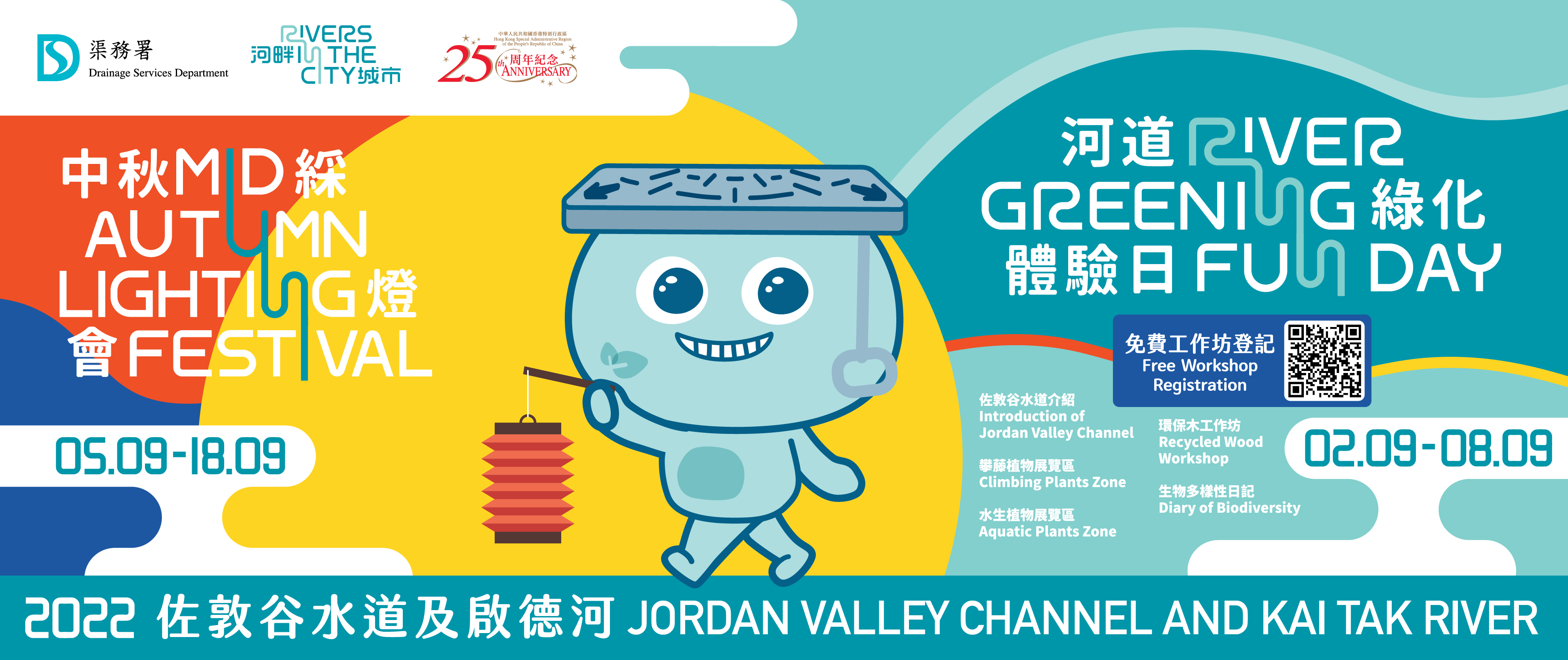 To celebrate the 25th anniversary of the establishment of the Hong Kong Special Administrative Region of the People's Republic of China, the Drainage Services Department (DSD) will host different activities, including the first festive lantern displays in urban river channels and an interesting River Greening Fun Day, to celebrate the coming Mid-Autumn Festival. Admission to all activities is free.