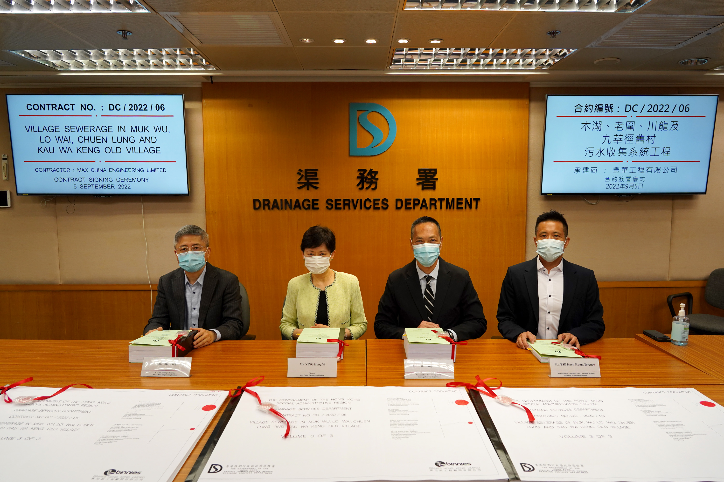 The Drainage Services Department signed a works contract of about $198 million with Max China Engineering Limited on 5 September 2022. The works include construction of about 1 kilometres (km) of gravity sewers, 1.3 km of twin rising mains and a sewage pumping station at Muk Wu; and construction of about 4.6 km of gravity sewers at Lo Wai, Chuen Lung Village and Kau Wa Keng Old Village. This 39-month works contract commenced on 30 August 2022.