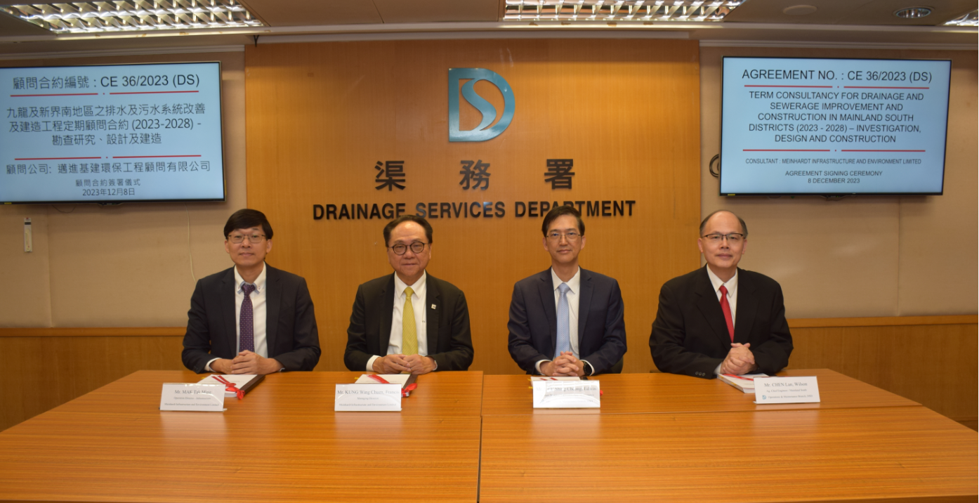 The Assistant Director/Operations and Maintenance, Mr LAU Shing Cheong (second right), the Ag. Chief Engineer/Mainland South, Mr CHEN Lan (first right) of DSD, the Managing Director, Mr KUNG Wing Chuen (second left) and the Operation Director – Infrastructure, Mr MAK Tak Ming (first left) of Meinhardt Infrastructure and Environment Limited attended the Agreement Signing Ceremony.