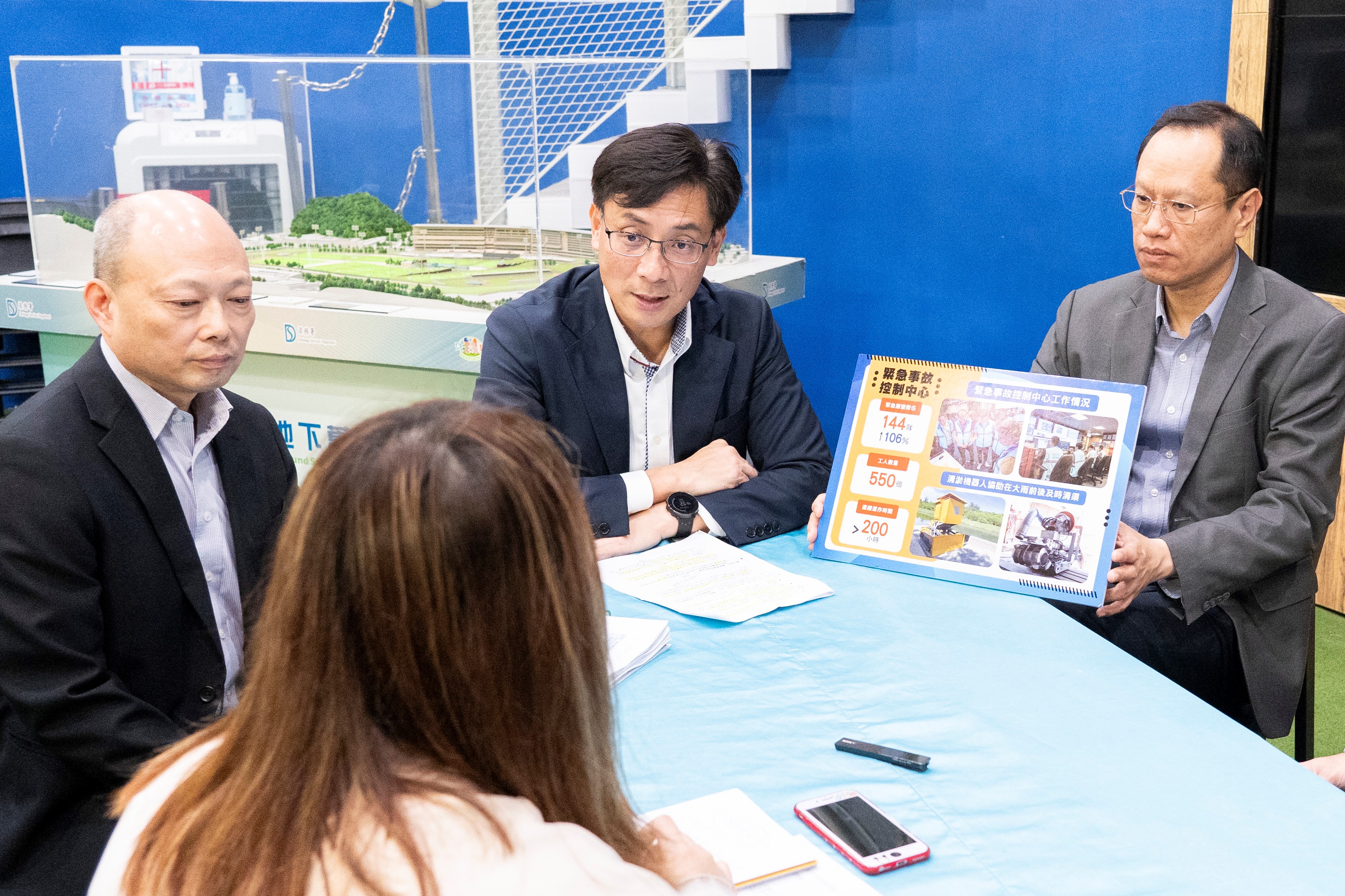 The Director of Drainage Services, Mr Ringo MOK Wing-cheong, gave an interview to Ming Pao on the DSD's flood prevention strategy, measures in coping with torrential rain, and drainage improvement works. Looking on are the Deputy Director of Drainage Services, Mr Peter CHUI Si-kay (right), and the Assistant Director/Projects & Development, Mr Brian CHOI Wing-hing (left)