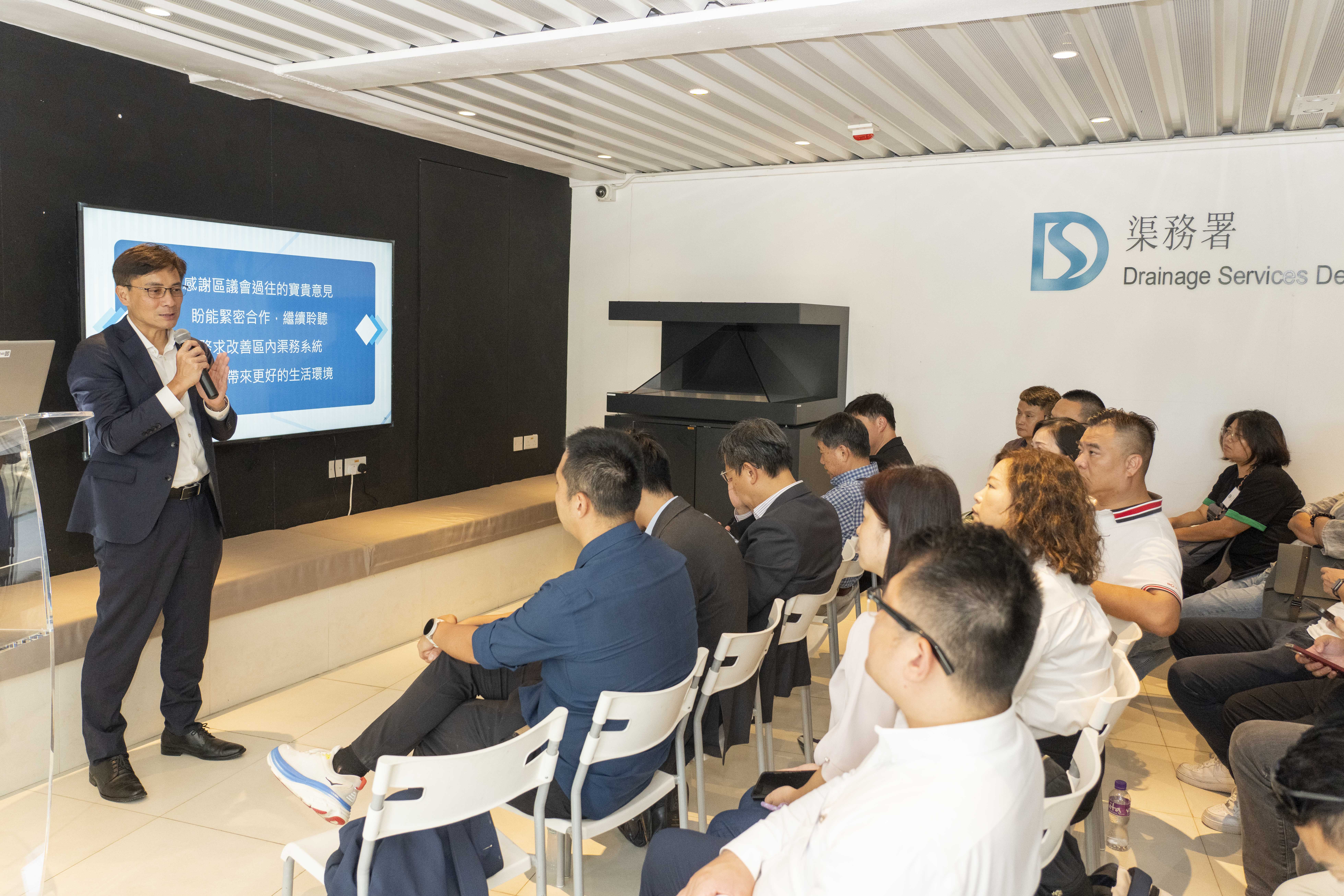 On 10 October 2025, the Director of Drainage Services, Mr Ringo MOK Wing-cheong invited the District Officer (Tsuen Wan) cum Chairman of Tsuen Wan District Council, Mr Billy AU Ka-shing, and Tsuen Wan District Council (DC) members to visit the Lai Chi Kok Drainage Tunnel. Mr MOK and his team firstly introduced the flood prevention, sewage and rehabilitation works of the DSD within Tsuen Wan District, shared the Integrated Flood Management Strategy and the associated "Adaption, Resilience and Management" measures. Both parties engaged in discussions on relevant issues to better understand the needs of the residents and strive to enhance the drainage services in the District, aiming to bring a better living environment for the community.