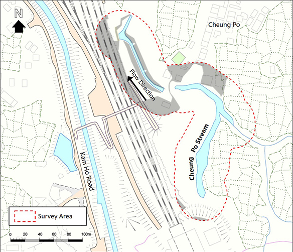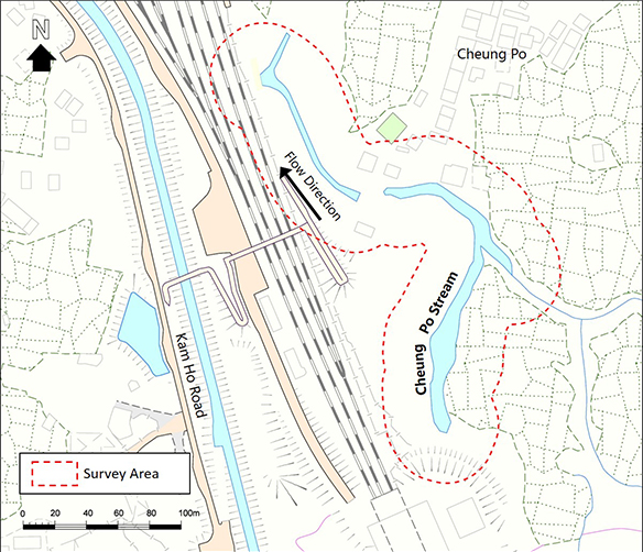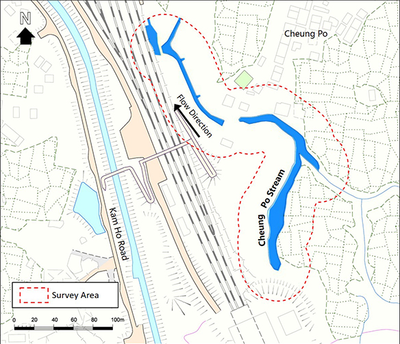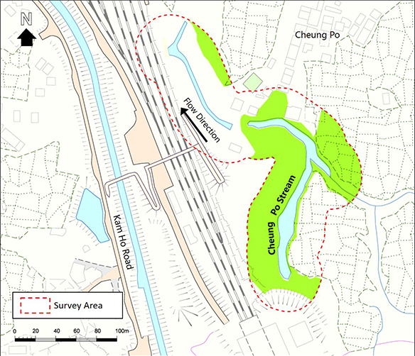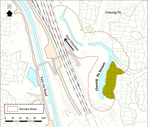 Cheung Po Stream is located at Yuen Long, northwest New Territories. The upper part is an Ecologically Important Stream. The lower part was channelized in 2011.