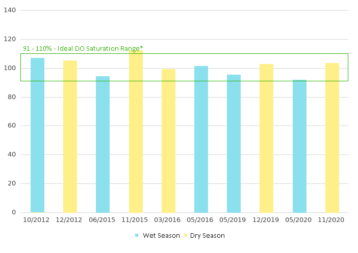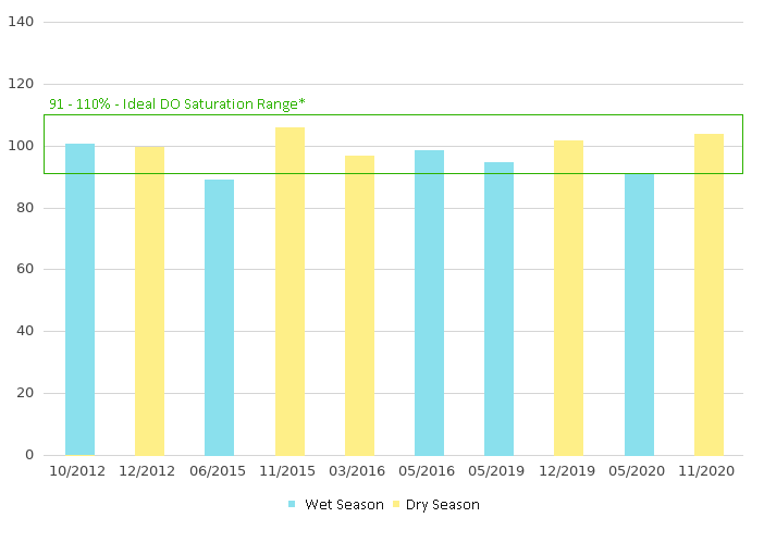 Dissolved Oxygen (DO) indicates the total amount of oxygen dissolved in the river channel water. DO supports aquatic fauna for respiration and maintenance of life. Dissolved Oxygen Saturation (DO (%)) falling in to 91 – 110% means excellent water quality with dissolved oxygen near or at saturation