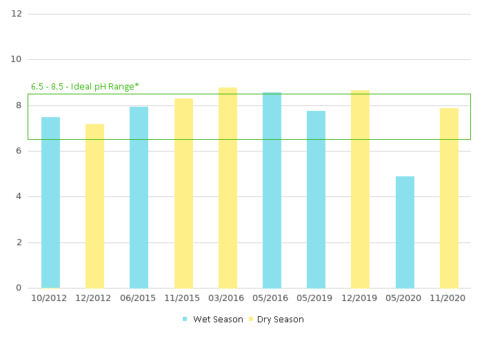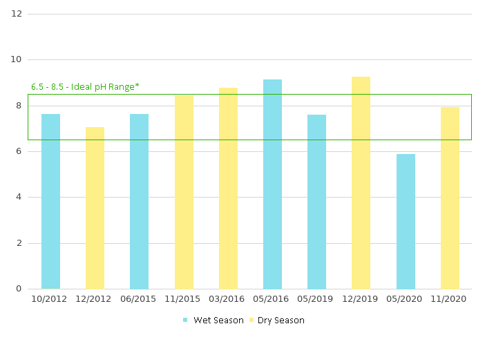 Provides indication of anthropogenic pollutants. pH falling into 6.5–8.5 indicating that there is unpolluted surface water supporting most of the aquatic biota.