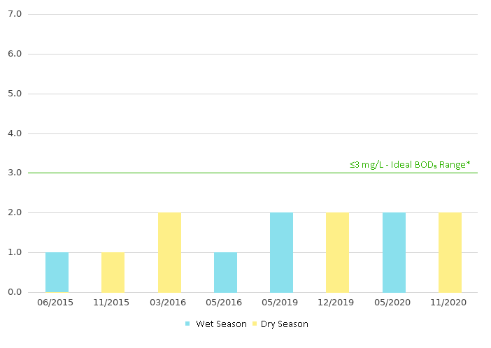 5-day Biochemical Oxygen Demand (BOD5) is the measure of the amount of dissolved oxygen consumed to break down organic material in five days by biological processes. High BOD5 level indicates water pollution. BOD5≤3 mg/L indicates excellent water quality