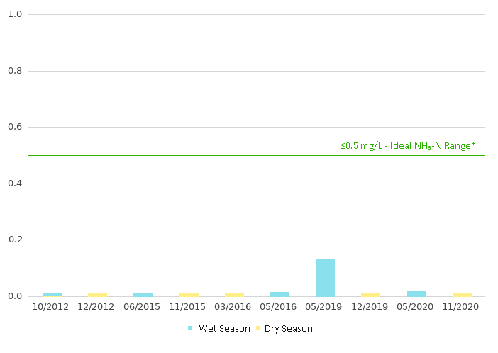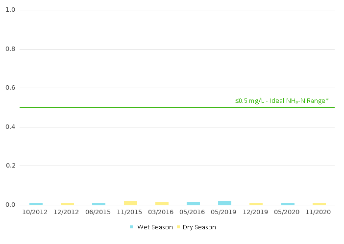 Ammonia-Nitrogen (NH3-N) Indicates the extent of organic contamination of the river channel. NH3-N < 0.5mg/L means that there is limited contamination by nutrient