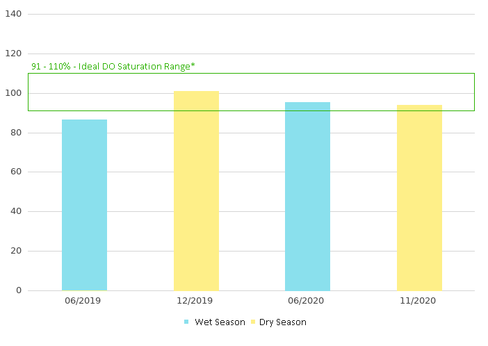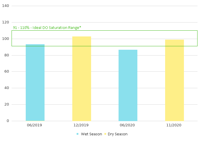 Dissolved Oxygen (DO) indicates the total amount of oxygen dissolved in the river channel water. DO supports aquatic fauna for respiration and maintenance of life. Dissolved Oxygen Saturation (DO (%)) falling in to 91 – 110% means excellent water quality with dissolved oxygen near or at saturation