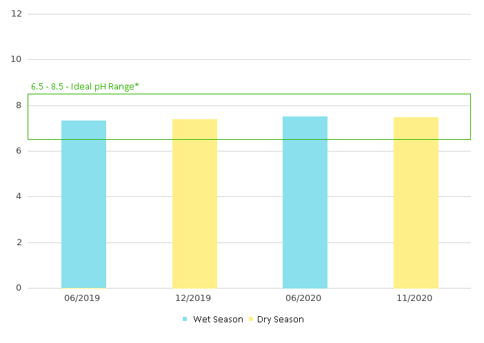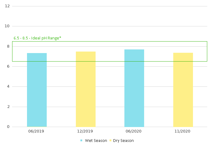 Provides indication of anthropogenic pollutants. pH falling into 6.5–8.5 indicating that there is unpolluted surface water supporting most of the aquatic biota.