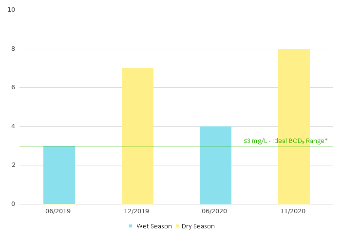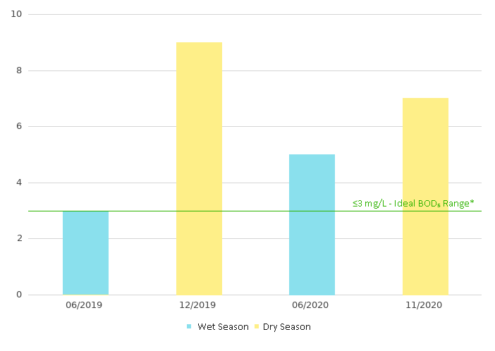 5-day Biochemical Oxygen Demand (BOD5) is the measure of the amount of dissolved oxygen consumed to break down organic material in five days by biological processes. High BOD5 level indicates water pollution. BOD5≤3 mg/L indicates excellent water quality