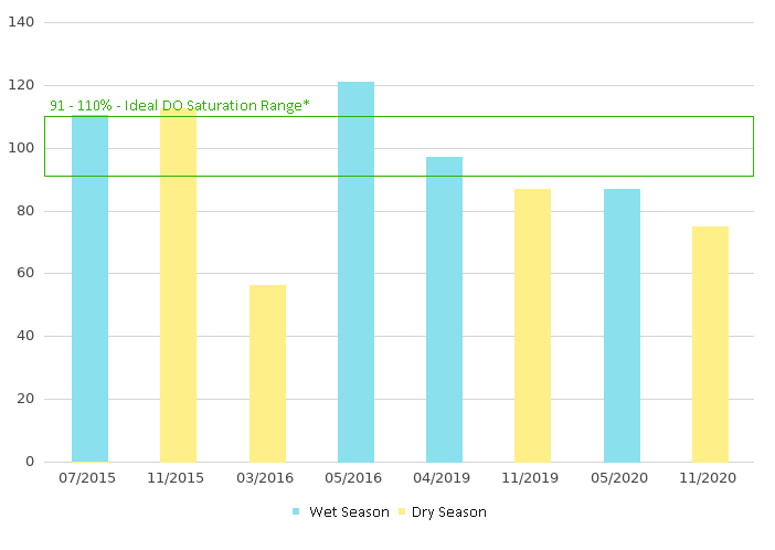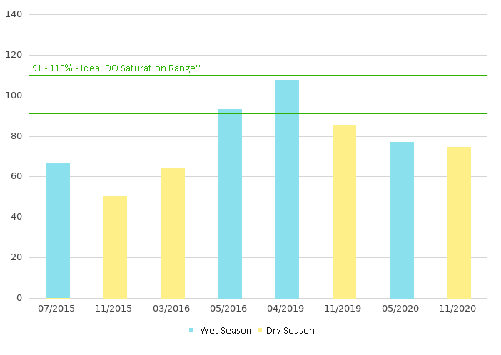 Dissolved Oxygen (DO) indicates the total amount of oxygen dissolved in the river channel water. DO supports aquatic fauna for respiration and maintenance of life. Dissolved Oxygen Saturation (DO (%)) falling in to 91 – 110% means excellent water quality with dissolved oxygen near or at saturation