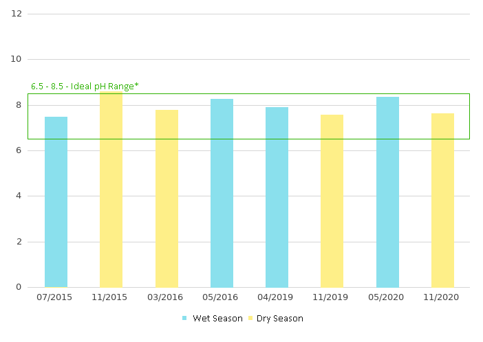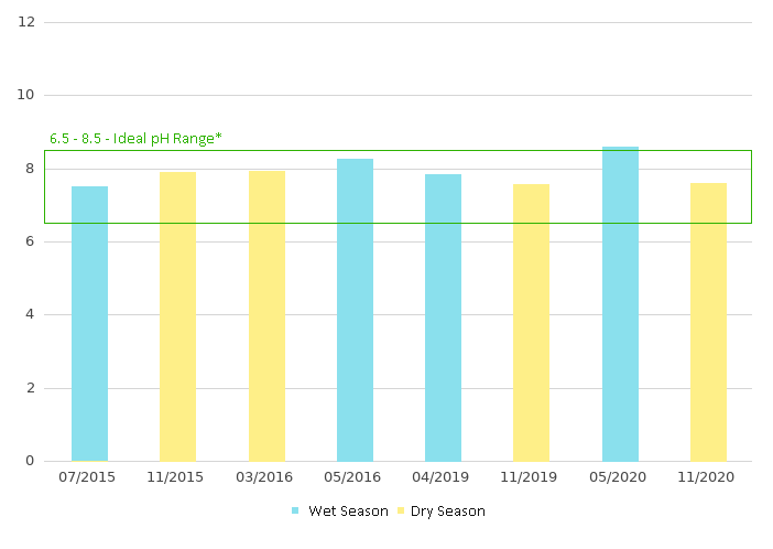 Provides indication of anthropogenic pollutants. pH falling into 6.5–8.5 indicating that there is unpolluted surface water supporting most of the aquatic biota.