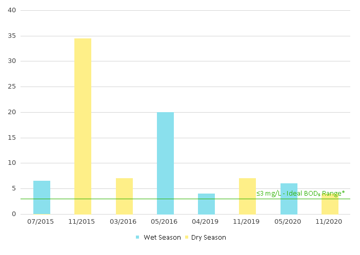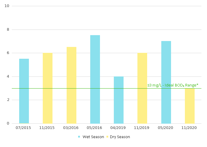 5-day Biochemical Oxygen Demand (BOD5) is the measure of the amount of dissolved oxygen consumed to break down organic material in five days by biological processes. High BOD5 level indicates water pollution. BOD5≤3 mg/L indicates excellent water quality