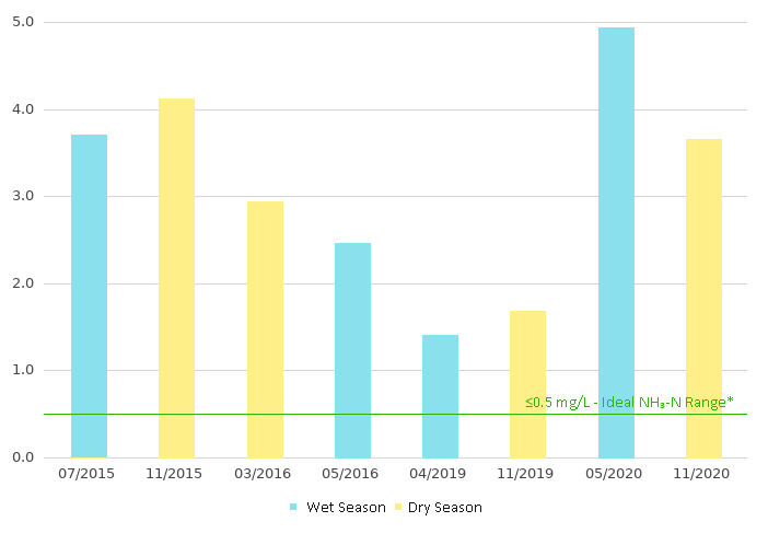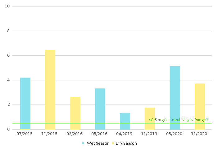 Ammonia-Nitrogen (NH3-N) Indicates the extent of organic contamination of the river channel. NH3-N < 0.5mg/L means that there is limited contamination by nutrient
